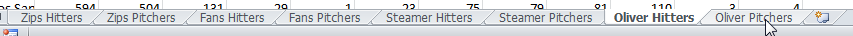 I’m going to download the hitter and pitcher projections from all four systems and pull the data into my rankings spreadsheet by repeating steps 2 through 5 for each projections system, paying careful attention to name each tab in such a way that I can easily identify the source of the data.
