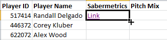 - Paste the BrooksBaseball URL copied above in to the formula. Note, you must surround the URL in quotation marks. Then enter a comma, to indicate the first portion of the formula is complete. And finally, type “Link” and a closing parentheses.