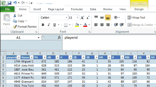 | 3. | Now return back to the Steamer Hitters tab in your main spreadsheet once again. Click once in cell A2 and paste the RoS information here. You should notice lower stat totals for every player because these are just stats for the remainder of the season.![]() |