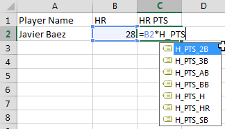 If we’re later trying to determine how many points Javier Baez will earn from home runs, we can multiply Baez’s projected home runs by “H_PTS_HR” instead of multiplying by 9 or by cell B7 (in the image above).