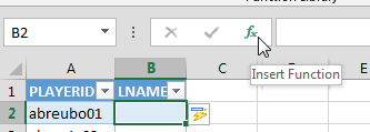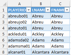 | 18. | Our goal in Column B is to instruct Excel to take the PLAYERID from column A (e.g. “abreujo01”), go into the first column of PLAYERIDMAP, find the matching PLAYERID, and then pull back the corresponding LASTNAME. You can see in the image of the PLAYERIDMAP below that LASTNAME is in the fifth column (column E).
