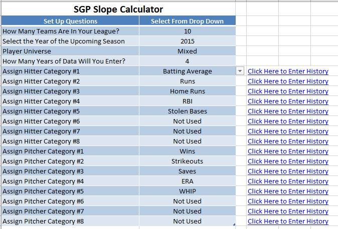 So after a few years of writing about SGP it finally dawned on me that, “I should create an Excel file that wraps all this together.” So that’s what I’ve tried to do. The “SGP Calculator” asks a few simple setup questions about your league, the amount of history you want to use, and then uses the SLOPE formula to calculate the standings gain points for each of your league’s scoring categories.