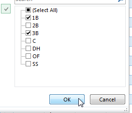 | 4. | Return to the “Hitter Ranks” tab. Now click on the downward pointing arrow on the “POS” column. Click/toggle the “Select All” box until all selections are cleared (none are checked). Then click to select only the “C” position. Click “OK” to accept this filter.![]() |