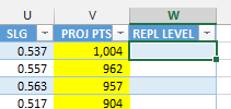 Type the equals sign and then use your mouse to click on the “PROJ PTS” and “REPL LEVEL” columns as needed while building the formula. |