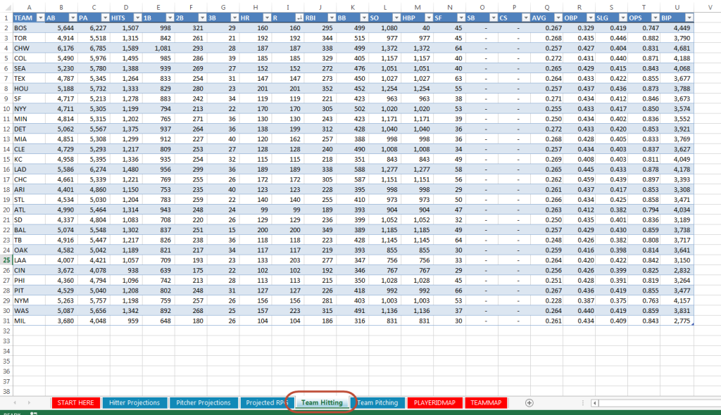 No problem. Click on an image below to see a much larger version. The “Hitter Projections”, “Pitcher Projections”, and “Team Hitting” worksheets are shown here.